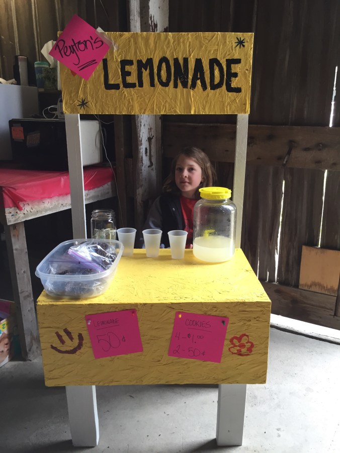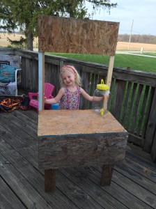 I’m that girl, that girl that LOVES garage sales!!! I love going to them, I love having them, I really love garage sales! This year I think is my ninth year having one. My son has set up a lemonade stand for the past few years but this year his little sister wanted to give it a try. So last Friday night she said mommy can we build me a lemonade stand now? Out to the scrap pile we went, because doesn’t every mom spend their Friday night building a lemonade stand??