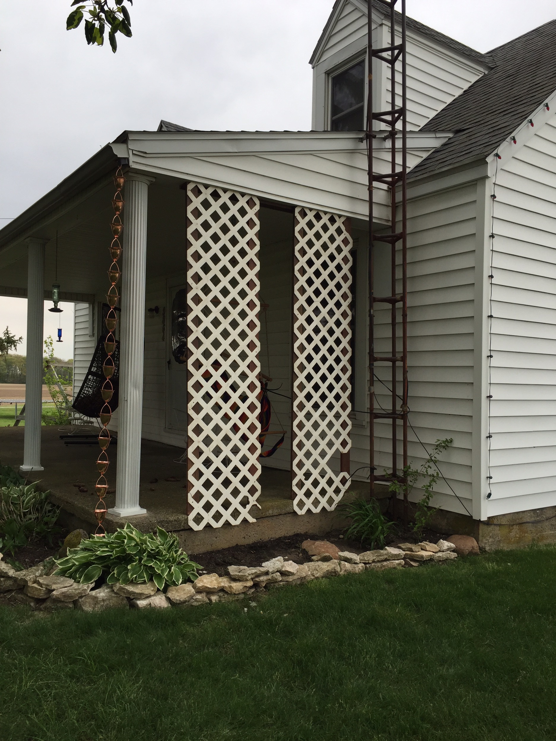 As I wrote about in the post about the potting bench, we were given an old deck and a few other old materials by some family. One of the things we did with these materials was added some privacy to our front porch! We took it from this-To this –I know it’s not the prettiest, but it’s previously used materials. So I think it’s flaws are gorgeous and only add character!! Form and function right there! I love my front porch!!