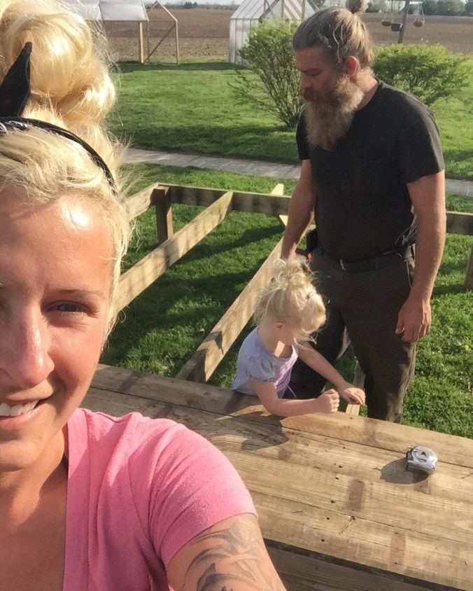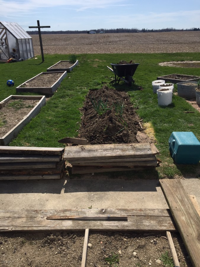 We were given an old deck off of my Great Aunt and Uncles house. They no longer wanted it and had plans to burn it. So we salvaged it and made a potting bench! We also built a new deck for Edyths playhouse, but that’s another story. This is where we decided to put the potting bench. I nicknamed this space my hot box garden box years ago when I moved in. A large box tucked up in a corner in full sun most of the day.