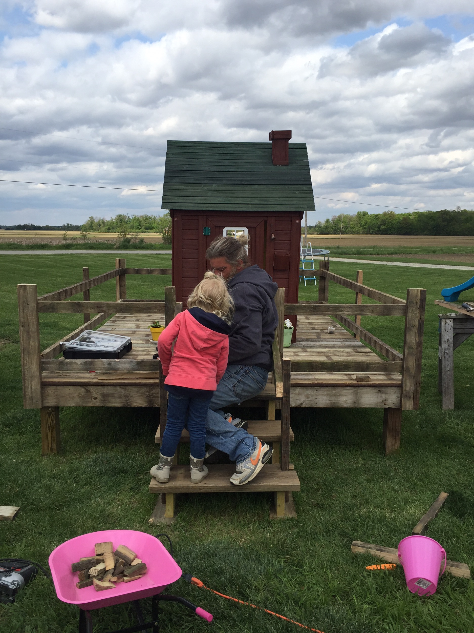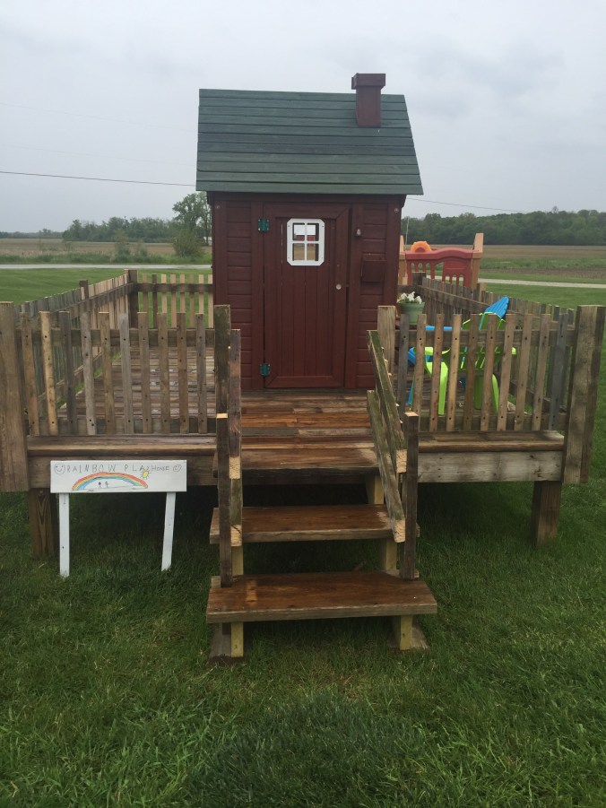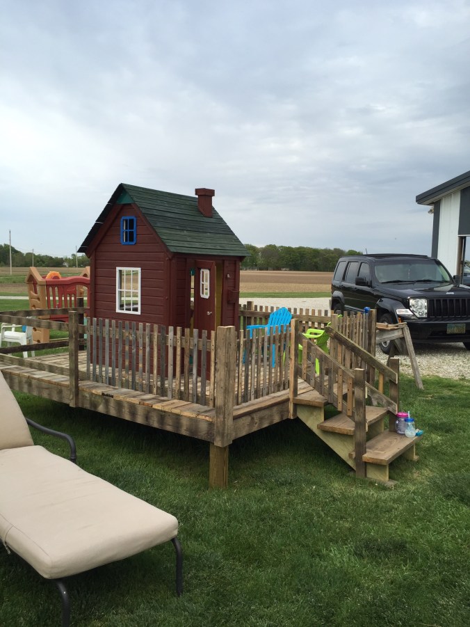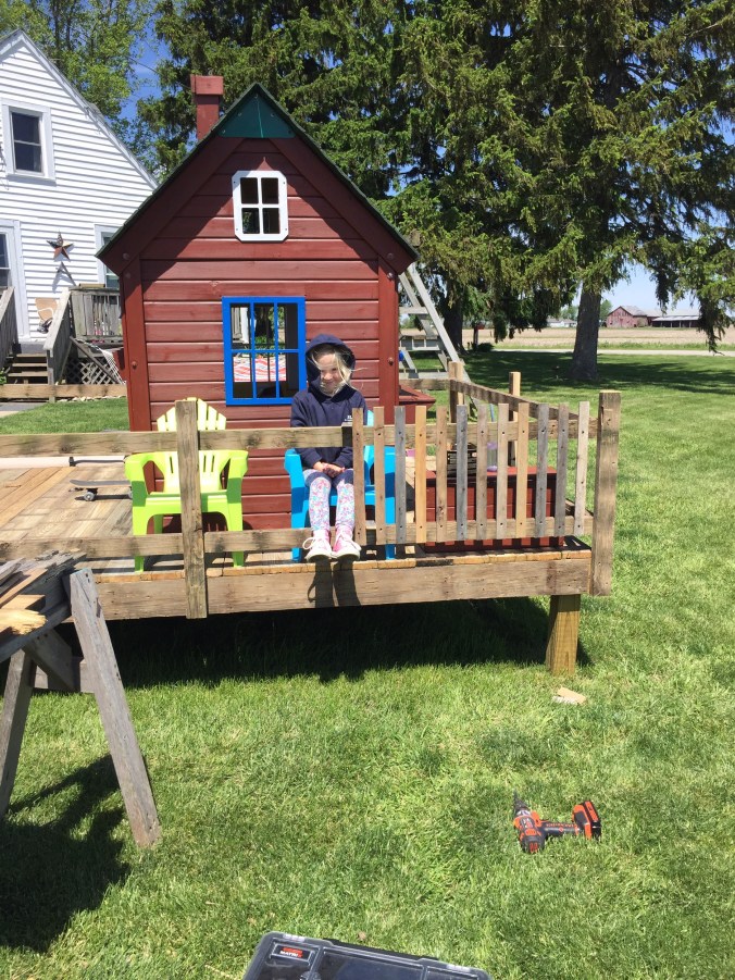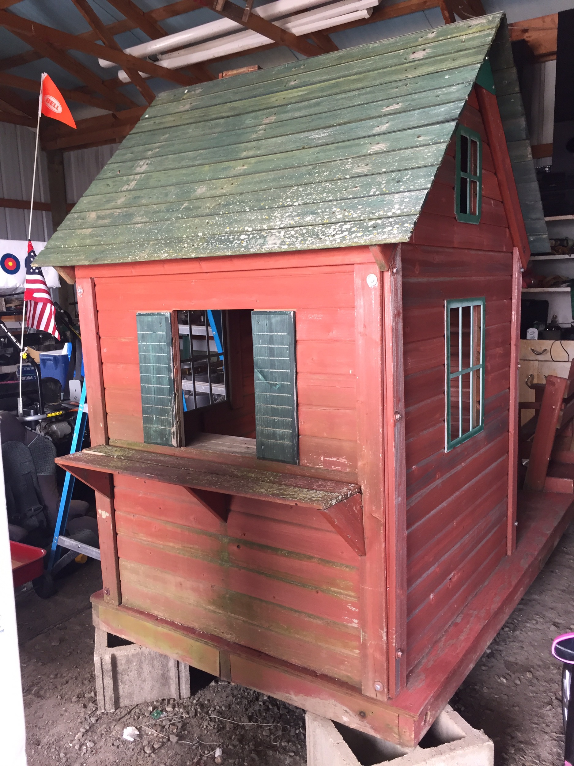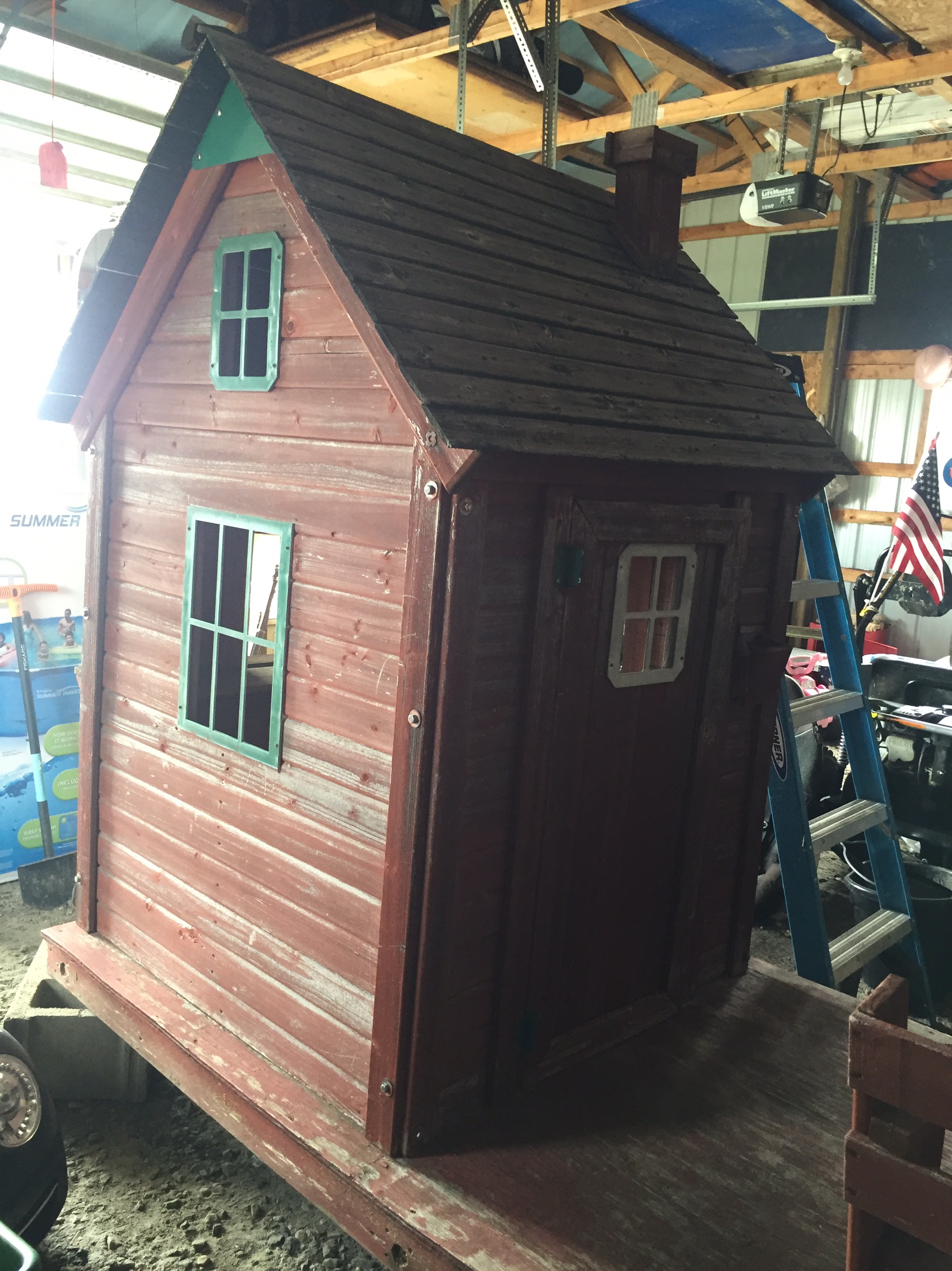We were given a playhouse for my son about 6 years ago. I put some fresh stain on it, built a platform for it and he loved it!!! Since then he has outgrown it, but had a little sister come along who now wanted to use it. After that many years it needed repaired. So we put it in the garage and repaired away!