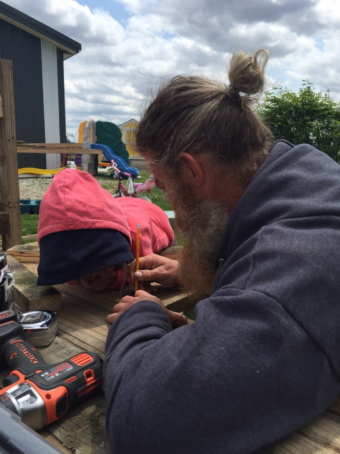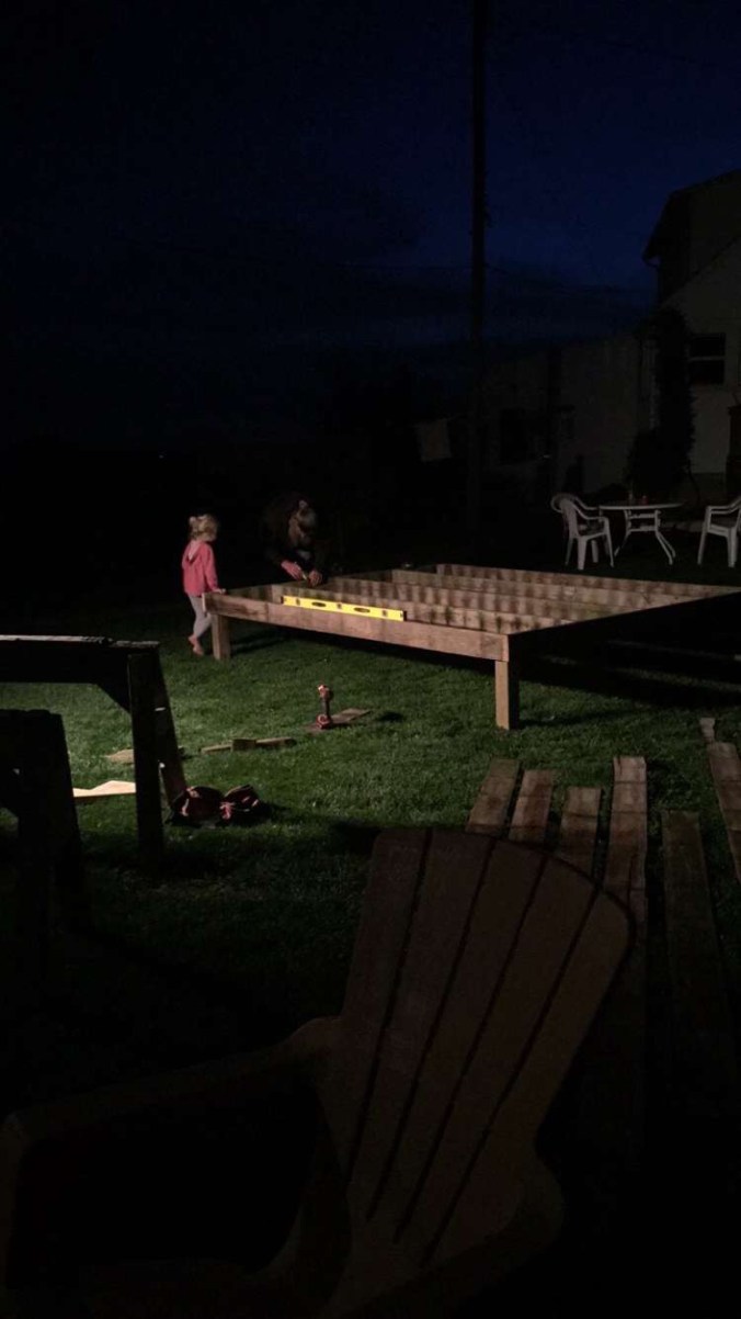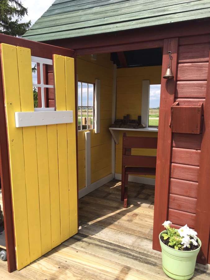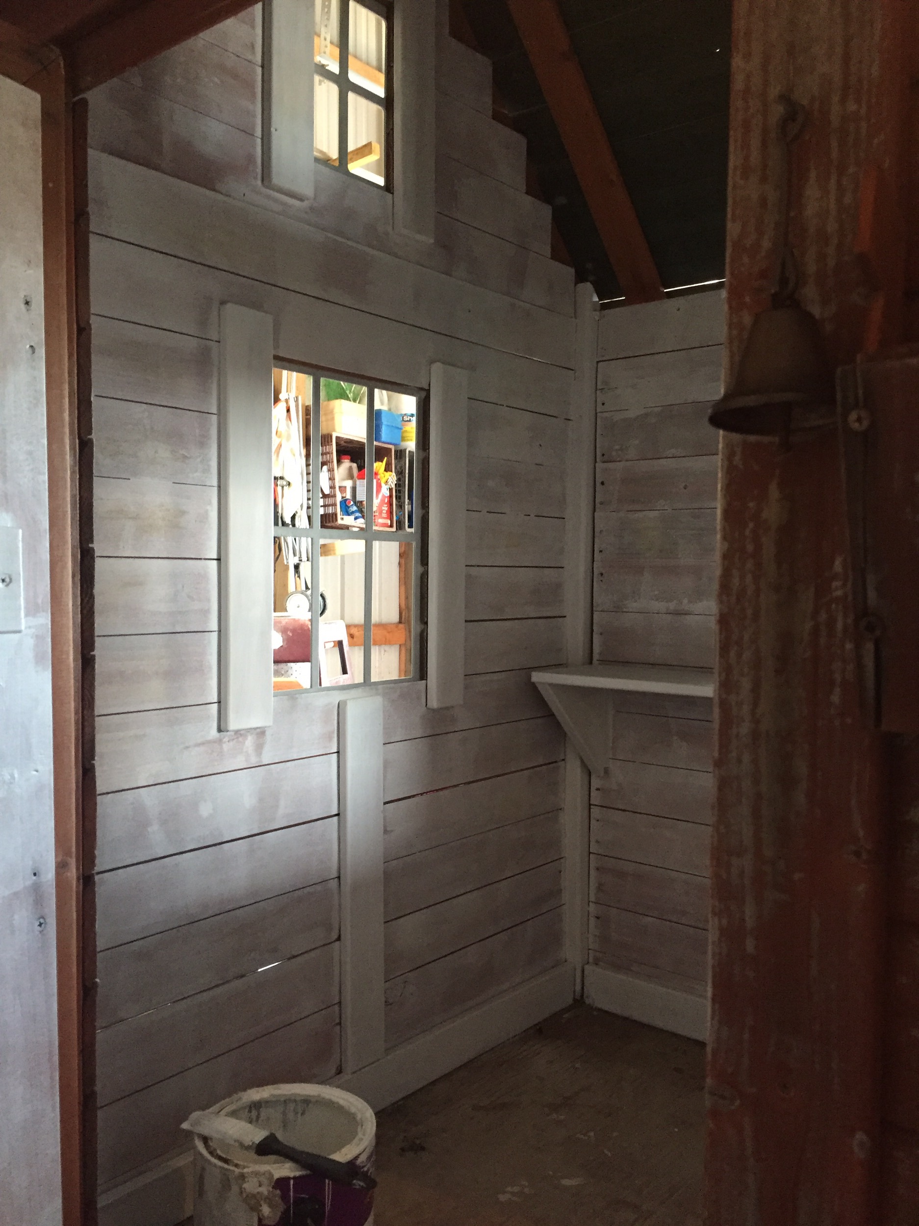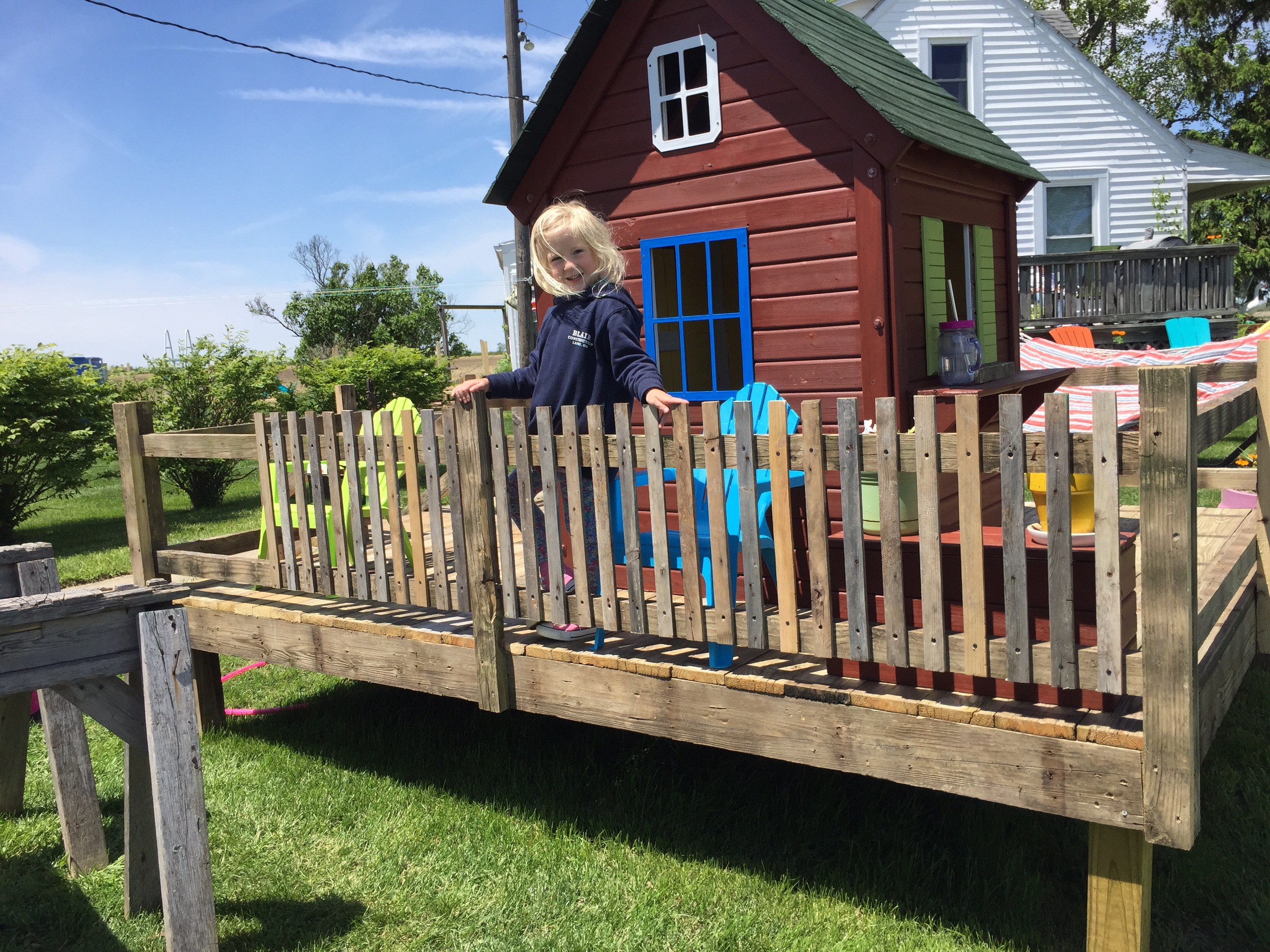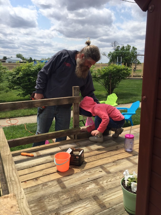 We were given a playhouse for my son about 6 years ago. I put some fresh stain on it, built a platform for it and he loved it!!! Since then he has outgrown it, but had a little sister come along who now wanted to use it. After that many years it needed repaired. So we put it in the garage and repaired away!
