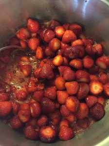 Next it was on to making jam!! I wanted to make a thick, chunky, lumpy basic jam. We decided on a simple strawberries and sugar recipe.